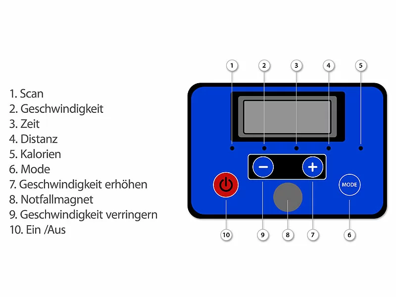 - Großes Multi-Display: Trainingszeit, Geschwindigkeit, zurückgelegte Entfernung, Kalorienverbrauch
