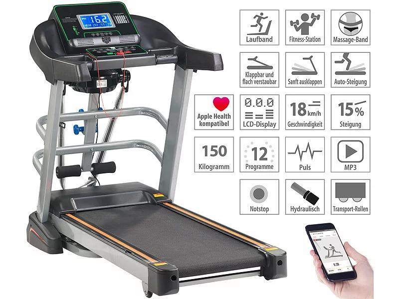 - Geschwindigkeit und Steigungsgrad: stufenlos einstellbar von 1 – 18 km/h und 0 – 15 %