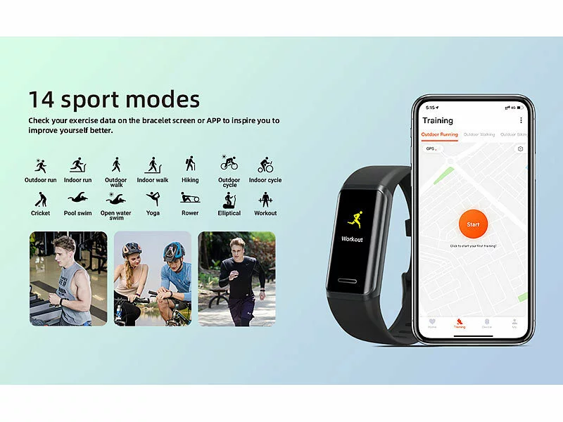 - Einstellung für 14 Sportarten: Laufen, Gehen, Laufband (rennen und gehen), Radfahren, Indoor-Cycling, Cricket, Bergwandern, Schwimmen, Zeitschwimmen, Yoga, Rudergerät, Crosstrainer und Fitness