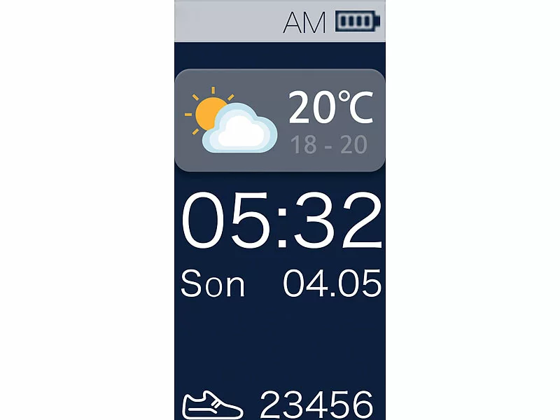 - Extras: Smartphone-Kamera-Fernauslöser und -Musik-Steuerung, Anzeige von Uhrzeit, Datum und Wetter, Armband-Finder, Wecker