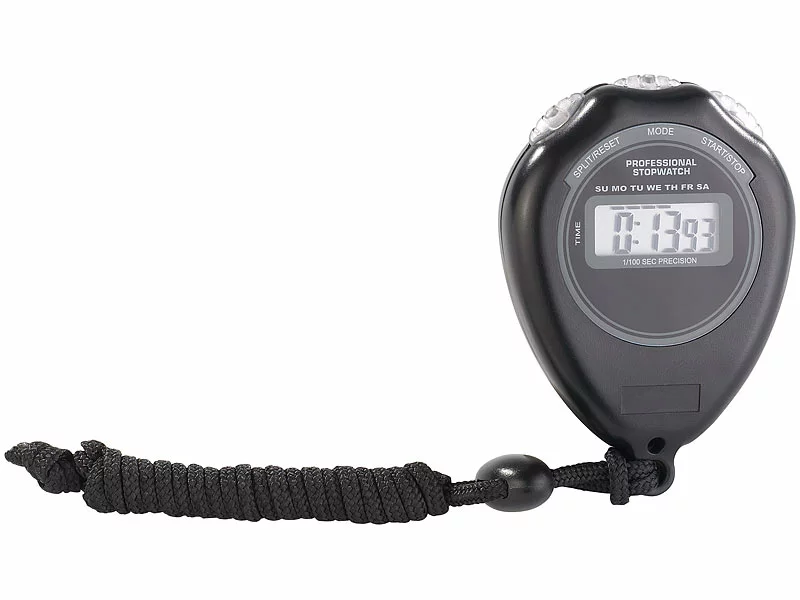 - Stoppuhr inklusive Knopfzellen-Batterie, Trageschlaufe und deutscher Anleitung