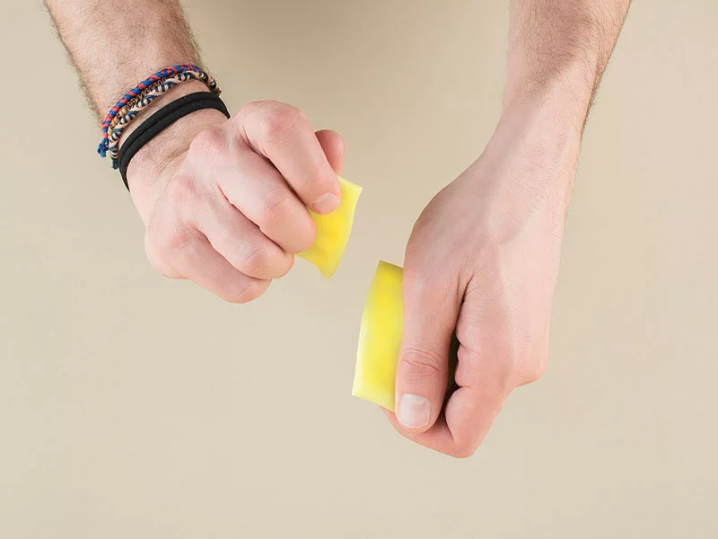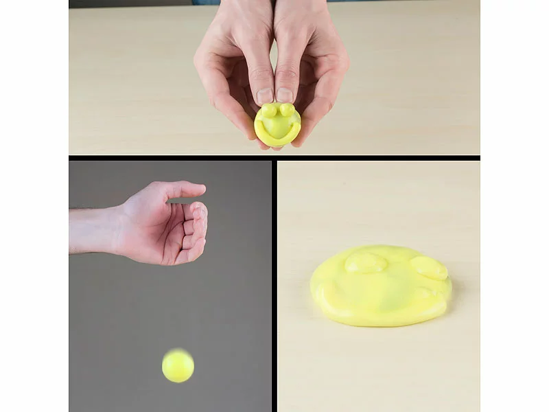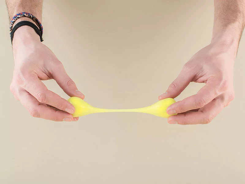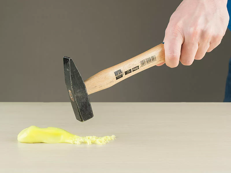 Mit verblüffenden Eigenschaften: Die Knete zerfließt langsam, wenn Sie sie liegen lassen und dehnt sich wie Kaugummi, sobald Sie sie langsam auseinanderziehen. Bei ruckartigem Ziehen zerreißt sie wie Papier. Und sie zerspringt wie Glas, wenn Sie z.B. mit einem Hammer draufschlagen.