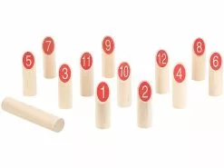 - Zubehör-Teile: 12 Kegel (nummeriert von 1 – 12) und 1 Wurfholz