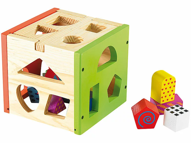 Anders als bei vielen anderen Spielen dieser Art befinden sich die Aussparungen auch an den Seiten des Würfels. So hält der Spielspaß lange an. Perfekt für die Förderung von Konzentration, Formenerkennung und Motorik von Kindern ab 3 Jahren!