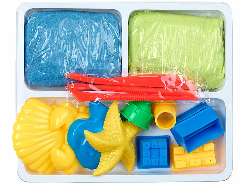 Legen Sie direkt los: Das Komplett-Paket enthält neben Sand in zwei Farben gleich 10 Sandförmchen sowie 3 Modellier-Werkzeuge. So zaubern Ihre Kinder im Handumdrehen detailreiche Meerestiere oder Burgen mit filigranen Mauern, Türmen und Zinnen.