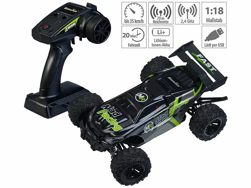 - 2,4-GHz-Funk für störungsfreien Betrieb auch beim Einsatz von mehreren Fahrzeugen, Reichweite: bis zu 70 m