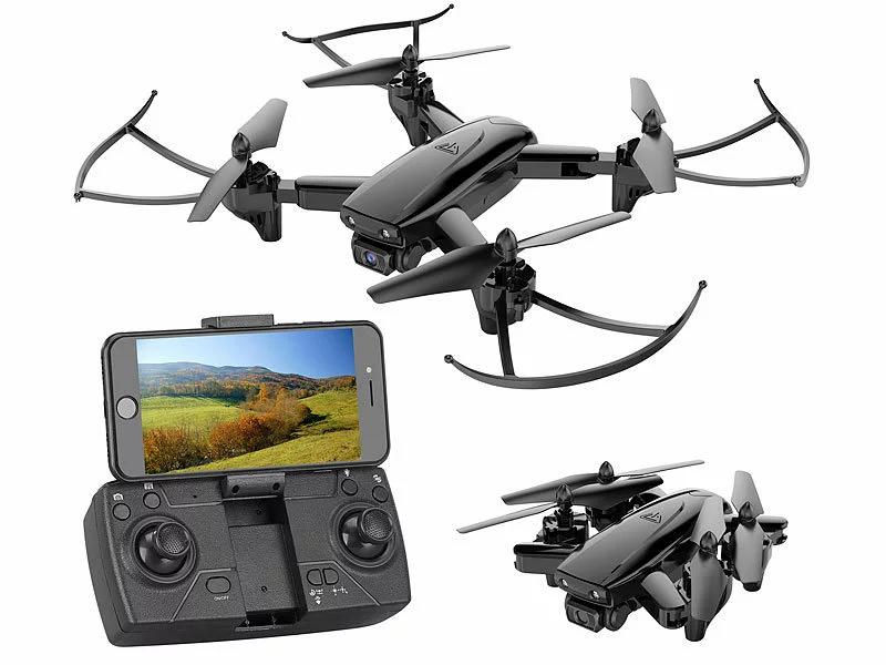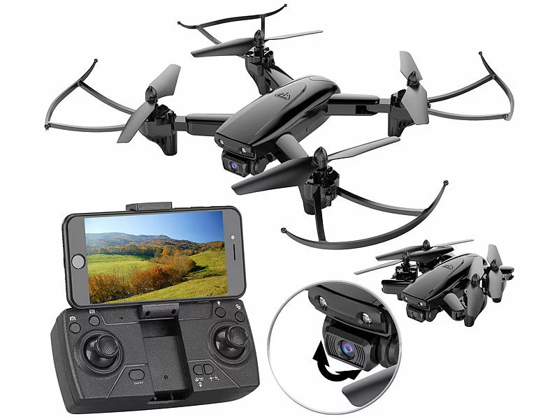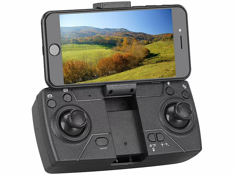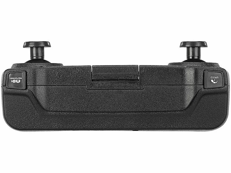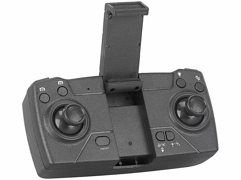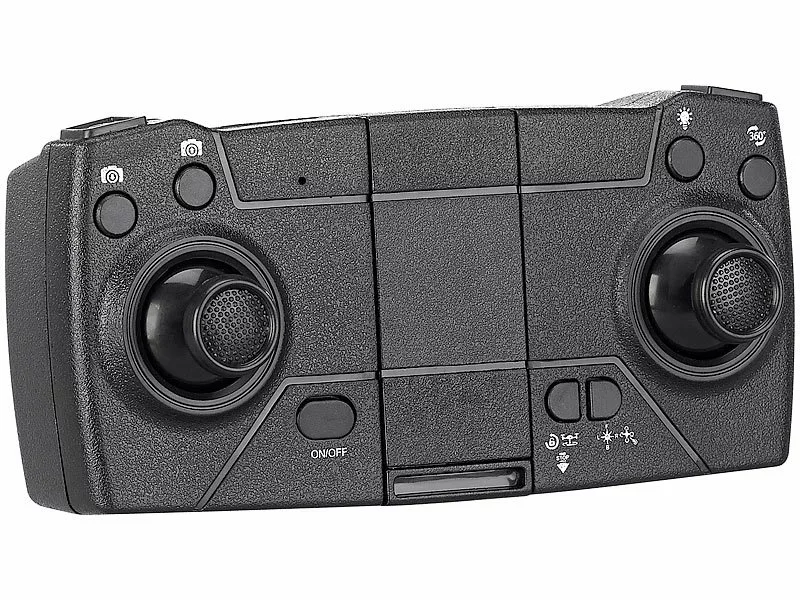 - Fernsteuerung mit 2 Steuerhebeln für 360°-Richtungskontrolle und Tasten zum selbstständigen Abheben und Laden, für Not-Landung, Geschwindigkeits-Stufe, Headless-Funktion, Rückkehr-Funktion sowie zur Aufnahme von Fotos und Videos