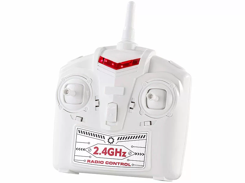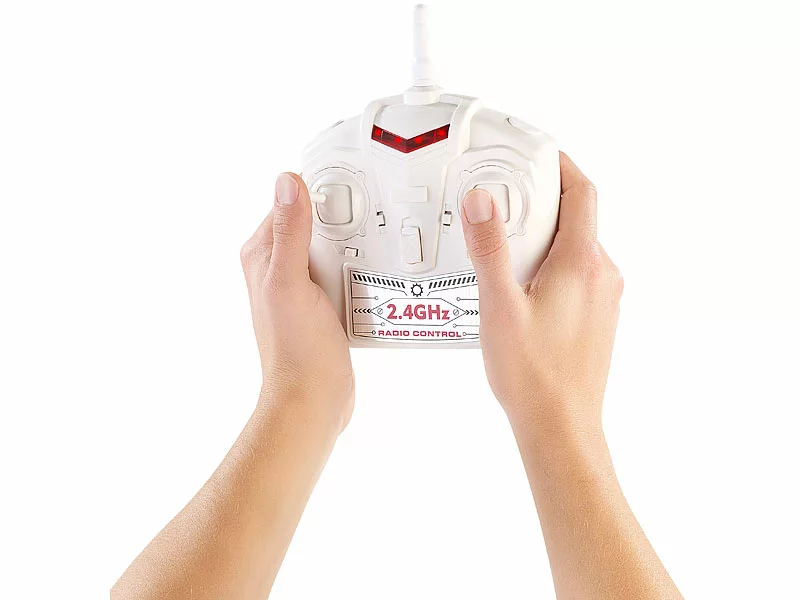 - 4-Kanal-Funkfernsteuerung: auf/ab, vorwärts/rückwärts, links/rechts drehen, links/rechts schweben