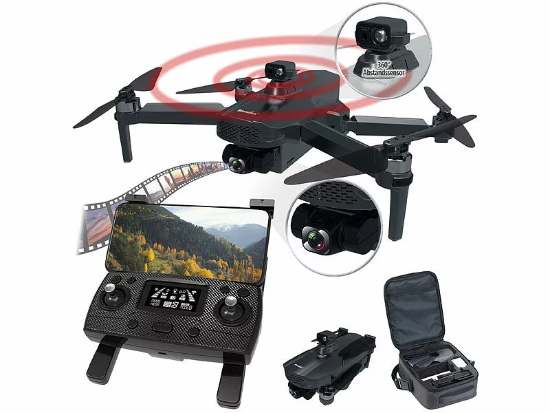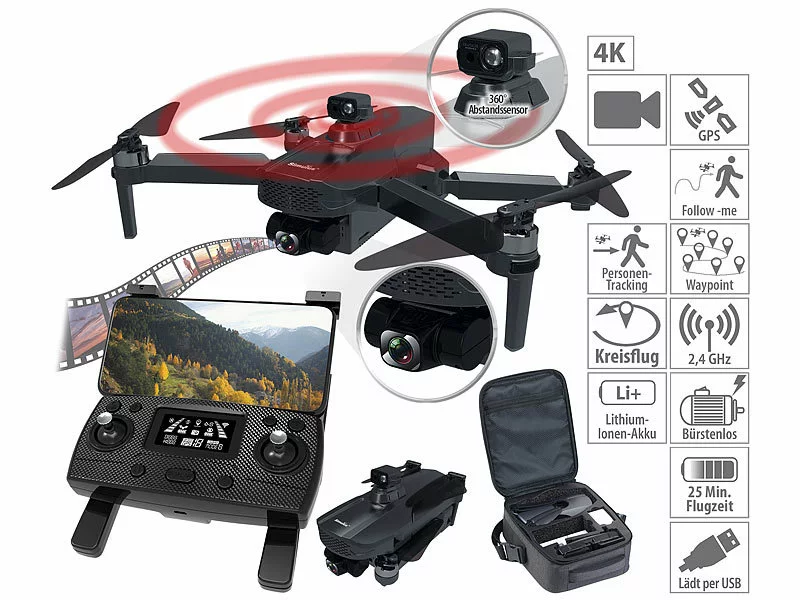 - Fernsteuerung mit 2 Steuerhebeln: für 360°-Richtungskontrolle, Aufnahmen u.v.m.